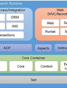Spring Framework는 Core Contrainer, Data Access/Integration, Web, AOP, Aspects, Instrumentation, test의 7개 카테고리 20여개의 모듈로 구성되어 있다. - 코어 컨테이너 코어 컨테이너(core Container)는 4개의 Core, Beans, Context, EL(Expression Language) 모율로 구성되어 있다. • Core 모듈과 Beans 모듈은 프레임워크의 기반이 되는 가장 핵심 부분으로, IoC와 DI 기능을 제공 한다. • Context 모률은 Core 모듈과 Beans 모듈에서 제공하는 기반하에 구성되었다. Context 모듈은 Beans 모듈의 기 능을 상속받고, 국제화, 이벤트 전이, 리소스 로딩, ..