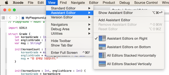Swift Playground에서 console output을 보여주는 매뉴는 다음과 같다.