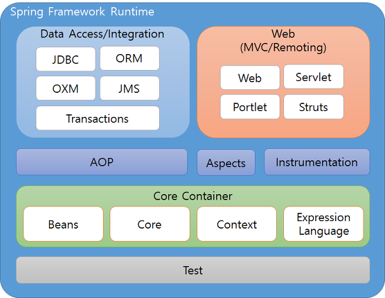 Spring Framework는 Core Contrainer, Data Access/Integration, Web, AOP, Aspects, Instrumentation, test의 7개 카테고리 20여개의 모듈로 구성되어 있다.