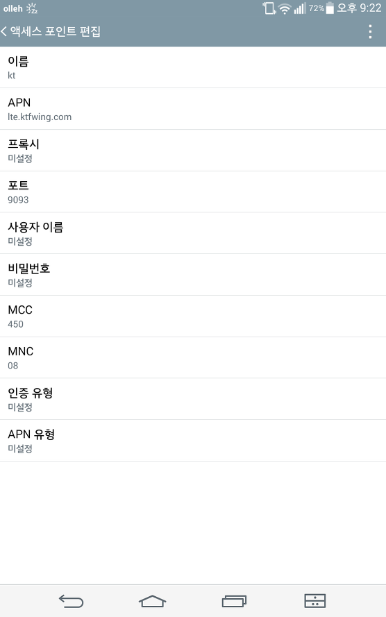 설정 > 추가설정 > 모바일 네트워크 > 엑세스 포인트 이름(매뉴) - 새 APN